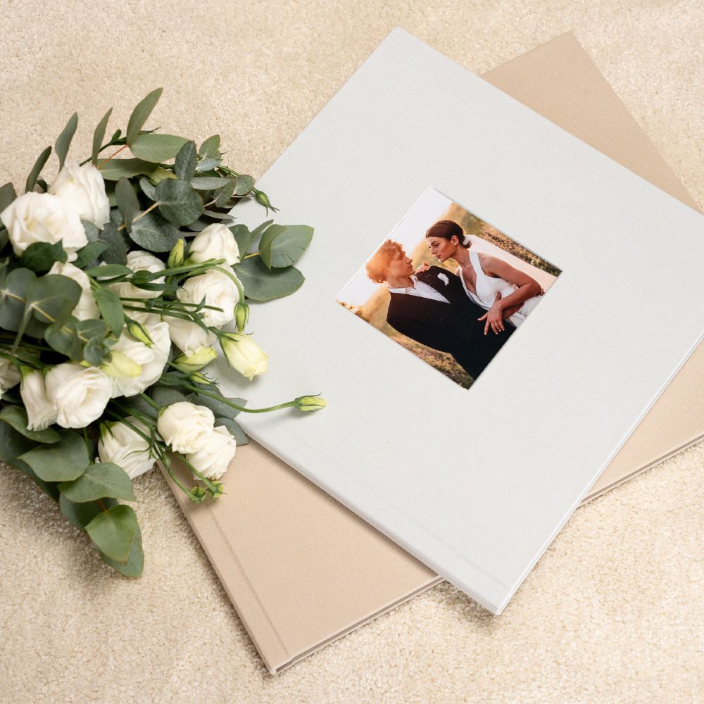 No modelo Cameo, a capa abre uma janela para a emoção. A tua fotografia favorita é integrada de forma permanente na capa em tecido, criando um leve relevo que a transforma no coração do álbum e num convite imediato para descobrir as memórias que guarda no interior.